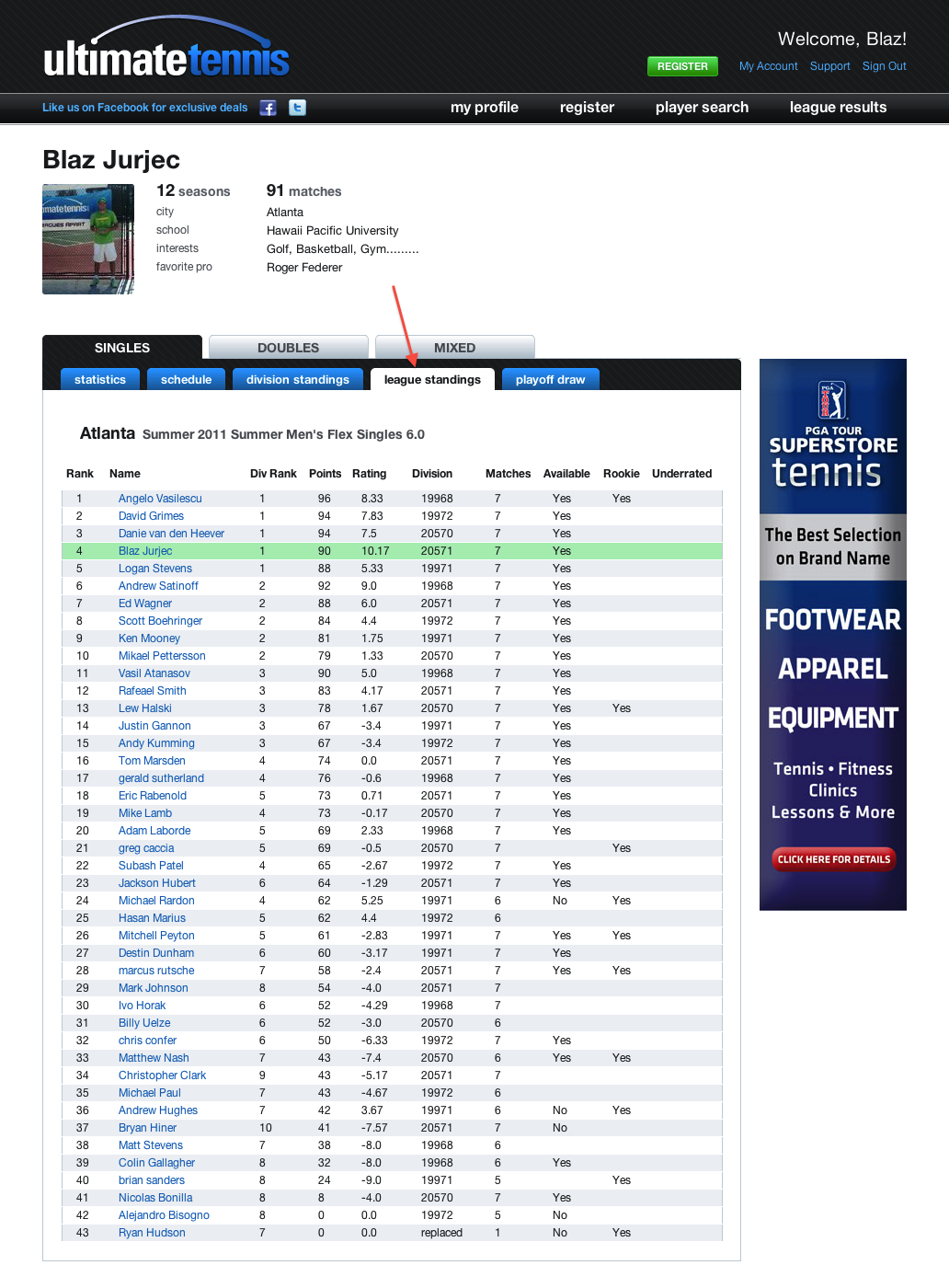 The league standings page shows the ranking order for all divisions at your skill level - in your city area. The final league standings at the end of the season will set the seeding order for the playoff tournament. Your name will be highlighted in green in the standings. Click another player's name to review their playing history.