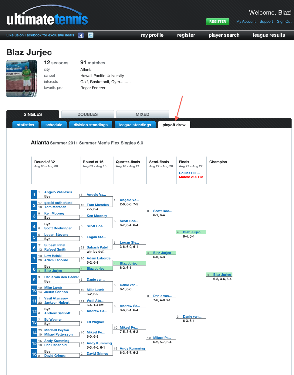 The playoff page takes you to the tournament draw for your most recent season of play. To see playoff draws for other skill levels, click "League Results" in the top menu.